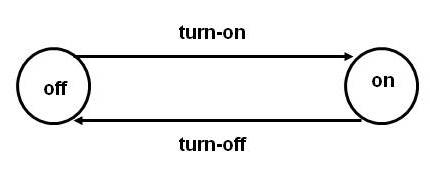 switch of an ordinary light. This state machine has only two states, named on and off represented by two circles