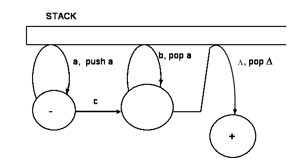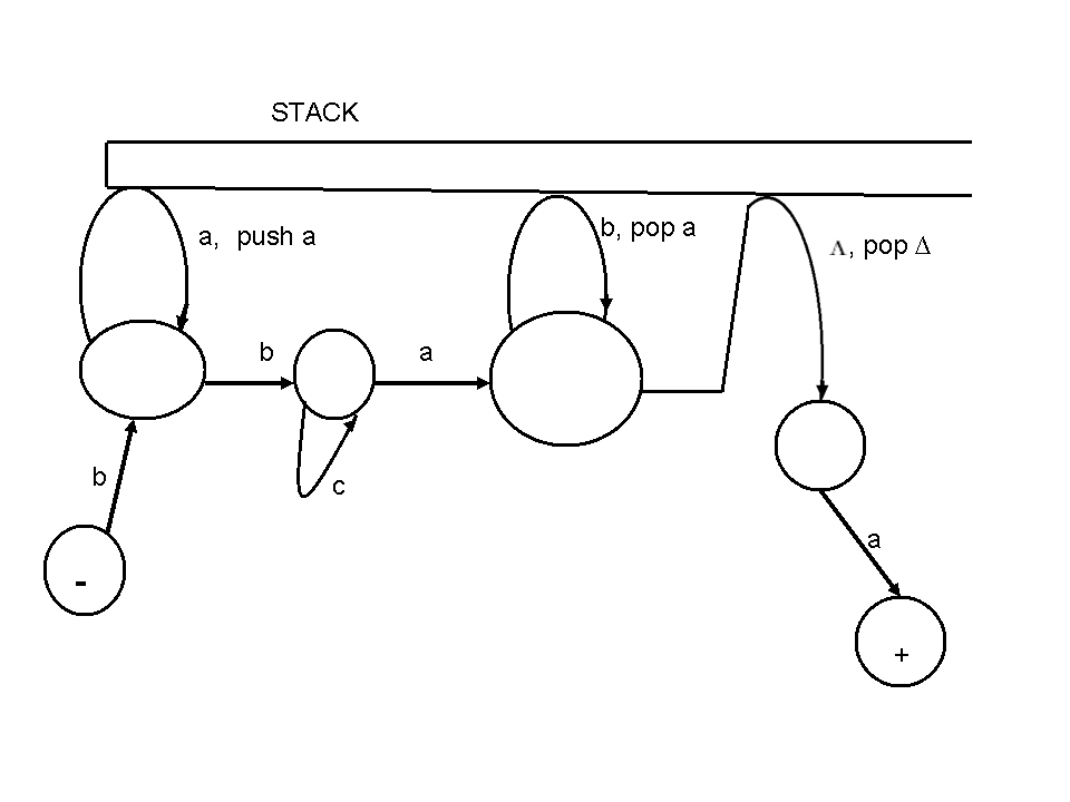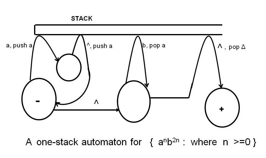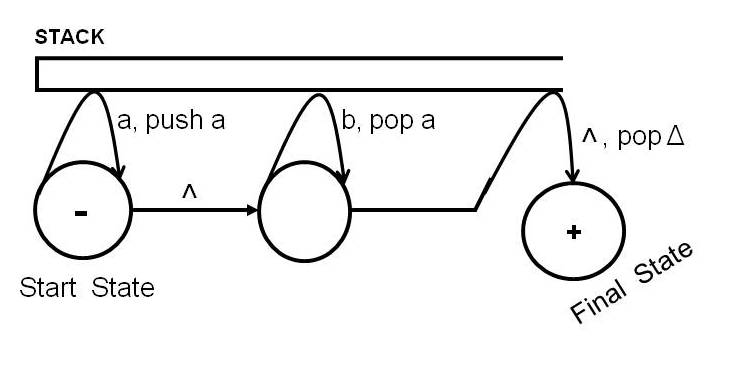 Suppose a string like aabb is given as an input to the above one-stack automaton. Then, the machine starts at the start state and scans the first a and pushes an a into the stack by taking the transition marked by, a, push a . Then it consumes the next a by taking the same transition marked by a, push a . Next, it consumes the symbol b, by taking the transition marked by b, pop a and poping an a from the stack. Then, it scans the next b by taking the transition marked by b, pop a . Then, it